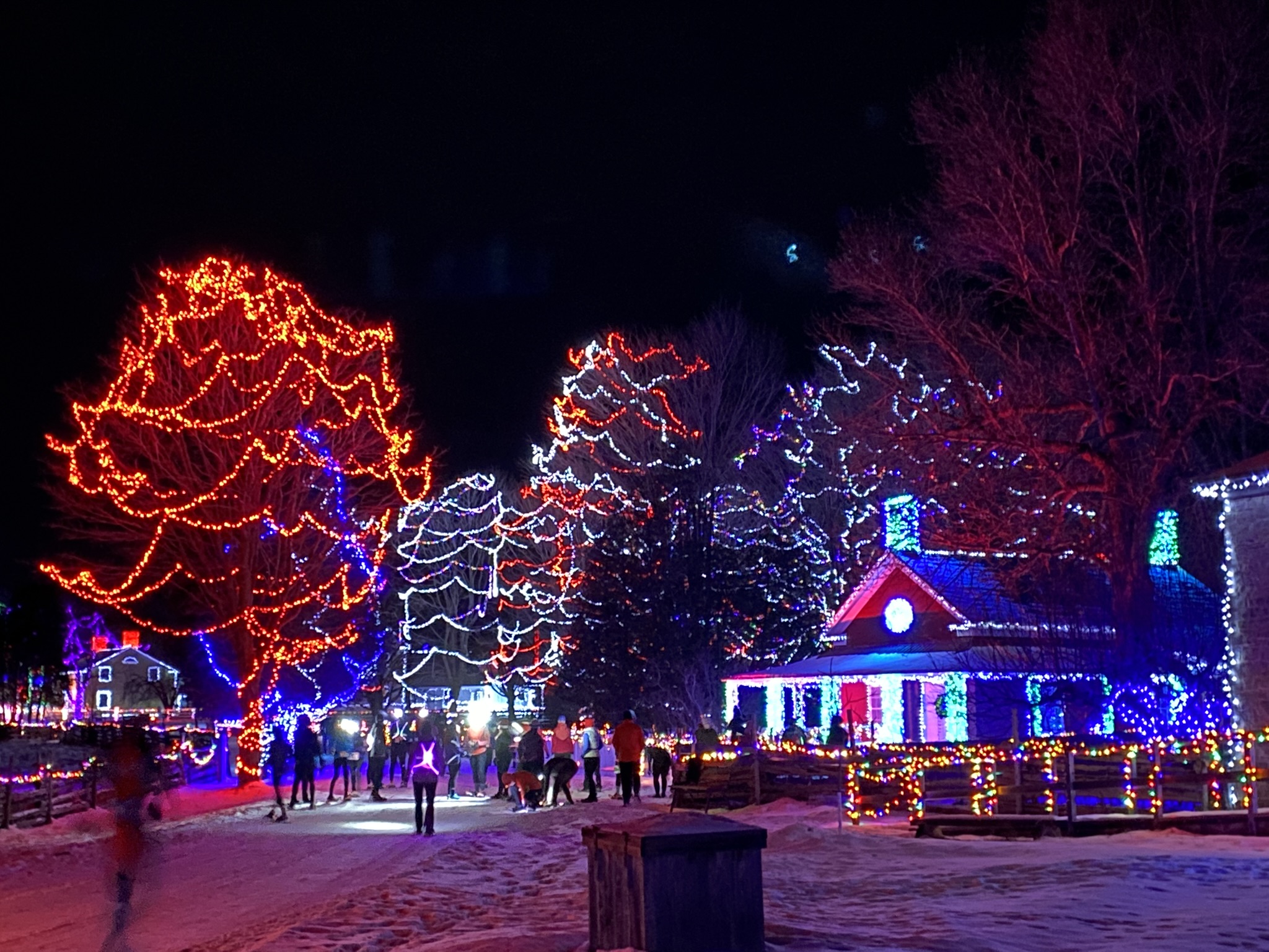 Would I do this again?! You bet! And it was an impressive low $35 early bird registration fee to boot! Tons of fun, and the lights in Upper Canada Village are truly impressive. One thing I will be doing next time is ensuring my headlamp is in better shape, so I can see the single-track trail a bit better. Thanks to Randy for lending me his running snowshoes. I might even practice running on snowshoes at least once before I participate again! Good thing I have Judy’s experience to draw upon. I’m looking forward to a 2023 version already – and would be eager to participate when we’re permitted to stick around inside The Heritage Barn for a more casual hot chocolate fix in a warm and inviting setting.