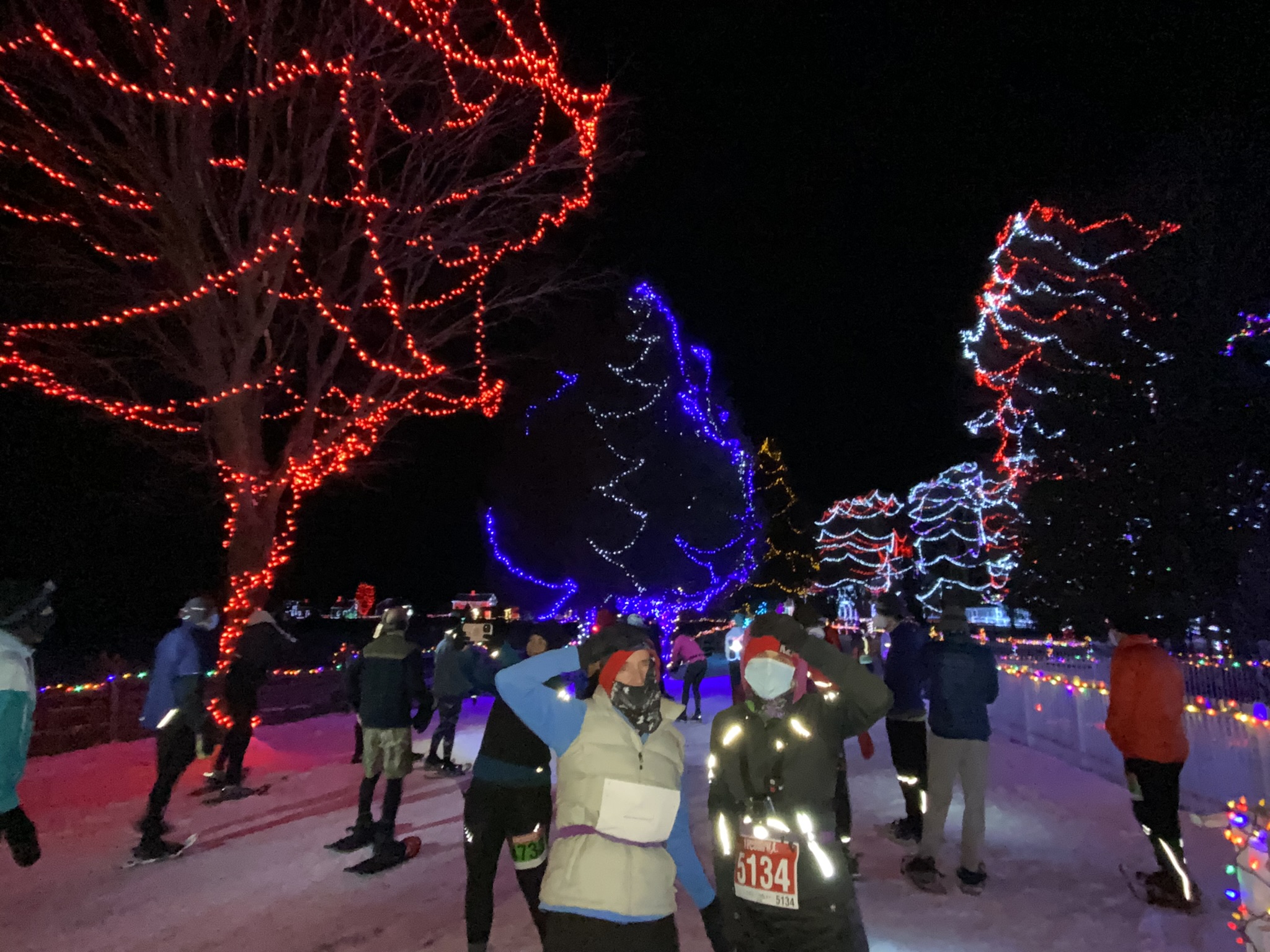 Grabbing our chip-enabled bibs & a bonus DION Neck Warmer at the colorful Harvest Barn check-in center, we quickly headed back to our vehicle and prepped ourselves for the run: gaiters, headlamps, light vests and appropriate layers. We grabbed our masks and snowshoes – and headed off to ‘the big red tree’ to get ready to start the run. Looks like reduced participation kept numbers thin, but this did not dampen the spirits of the organizers and runners on this beautiful, clear colorful evening. The crunching of our snowshoes on the packed road to keep warm at the starting area was impressive – and everyone stopped moving to hear the final marshalling instructions before the starting horn was sounded, and we were off.