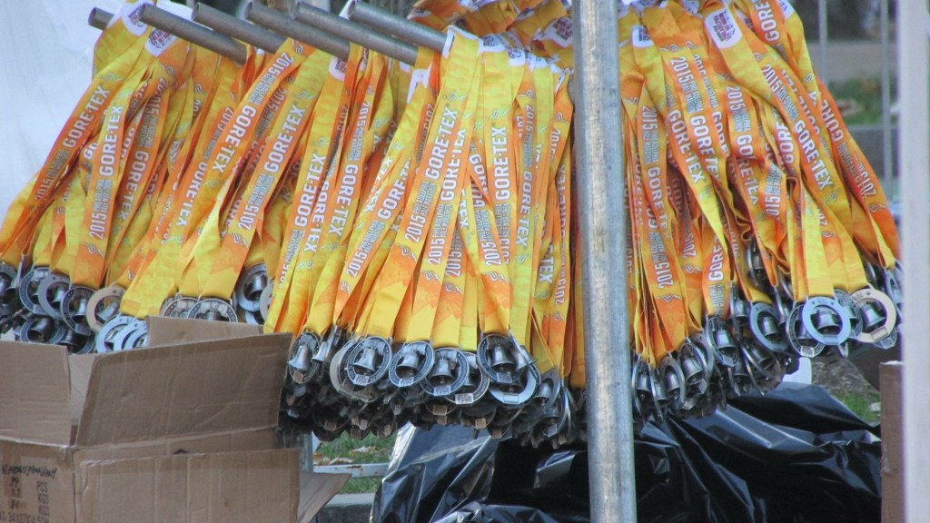 The start on race day had its ups and downs. Anyone entering the start area had to clear security. I completely understand the need for security. This race was only one week after the attacks in Paris, and ever since the bombings in Boston, we all recognize that a big race is a potential target. Unfortunately the security was not organized as efficiently as possible to get runners into the start. Some runners waited in line 30 minutes and then discovered they could have walked 2 minutes to another entrance with a 5 minute line. Some runners did end up starting late. So hopefully this is something that will improve in future years. Perhaps better signage, more volunteers letting people know about alternate entrances, better separation in the line ups of runners with bags/without bags/ spectators. Again, I appreciate the need for security and thank the volunteer who turned back the spectator who tried to enter the start area with pepper spray in his bag. But arriving at 6 AM for the 7 AM start was a mistake on our part and several other thousand runners, so room for improvement there. (Note from Judy: I have run this race three times and this was the only year we saw issues like this)