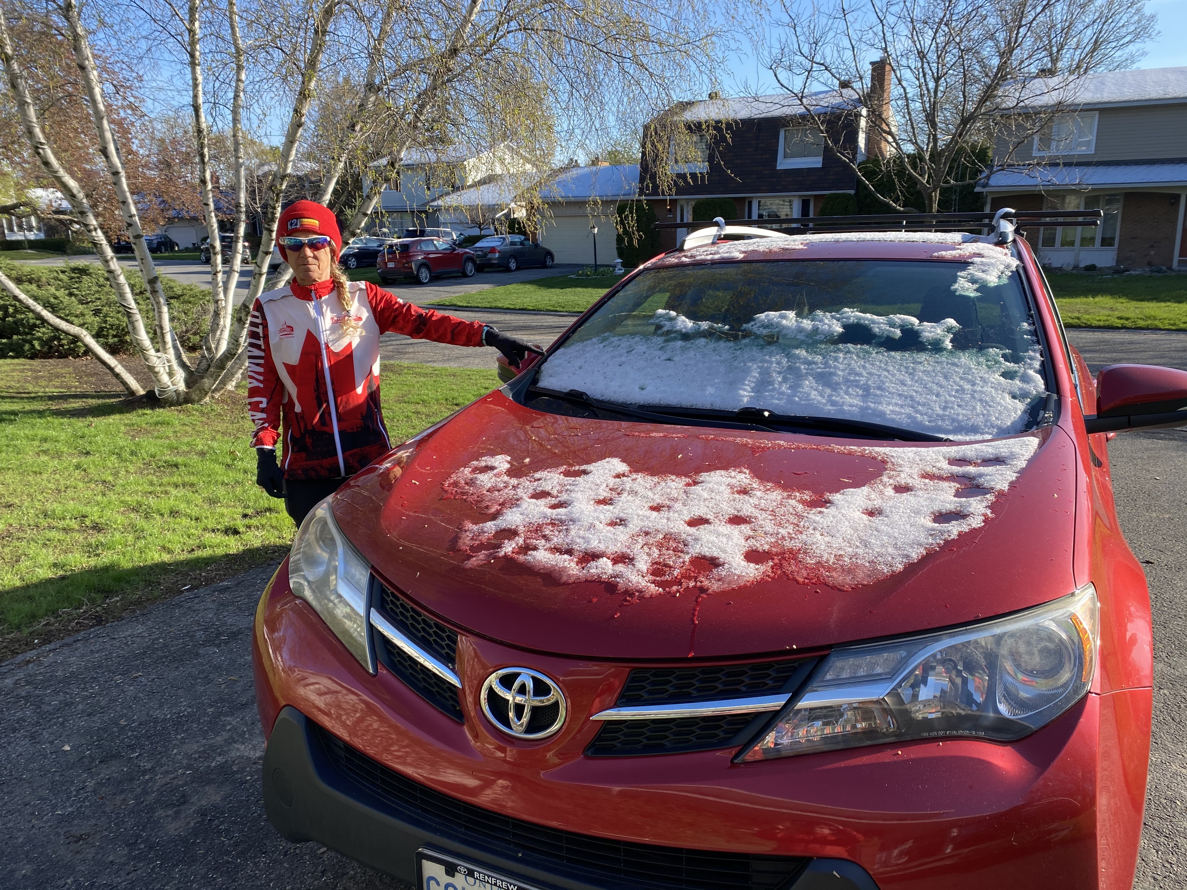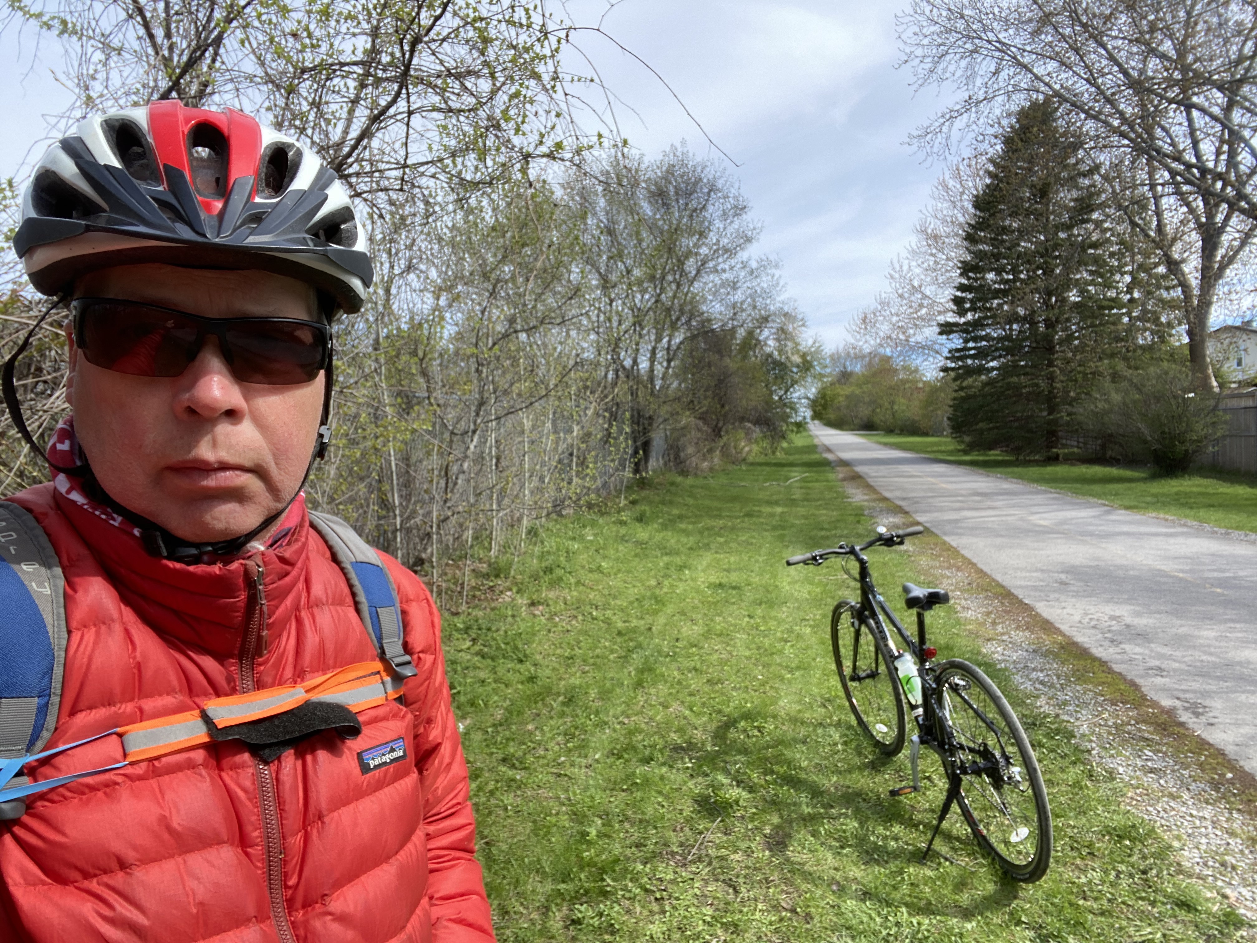 With yesterdays surprise snowfall, it was a bit chilly – but dry. The nice advantage of having a 1 person virtual marathon event is we can pick the day, and the start line is a very convenient location at the front of the house! With clear skies, and warming day forecast, we set off in the morning with a chilly -3C, snow remaining in the shadows. Judy brought her trusty RunK2J Toque out of seasonal retirement, and I was wearing a down jacket on my hybrid bike, loaded with a backpack of water, electrolytes and nutation to hand off at designated checkpoints along the course. Here we are at the Start Line area, and with little fanfare, we’re off on the three loop ‘stay local’ lockdown friendly course, carefully designed to minimize major intersections. There are lots of little diversions onto courts and turns, as being a virtual event, Judy was not overly concerned about running a super quick time!