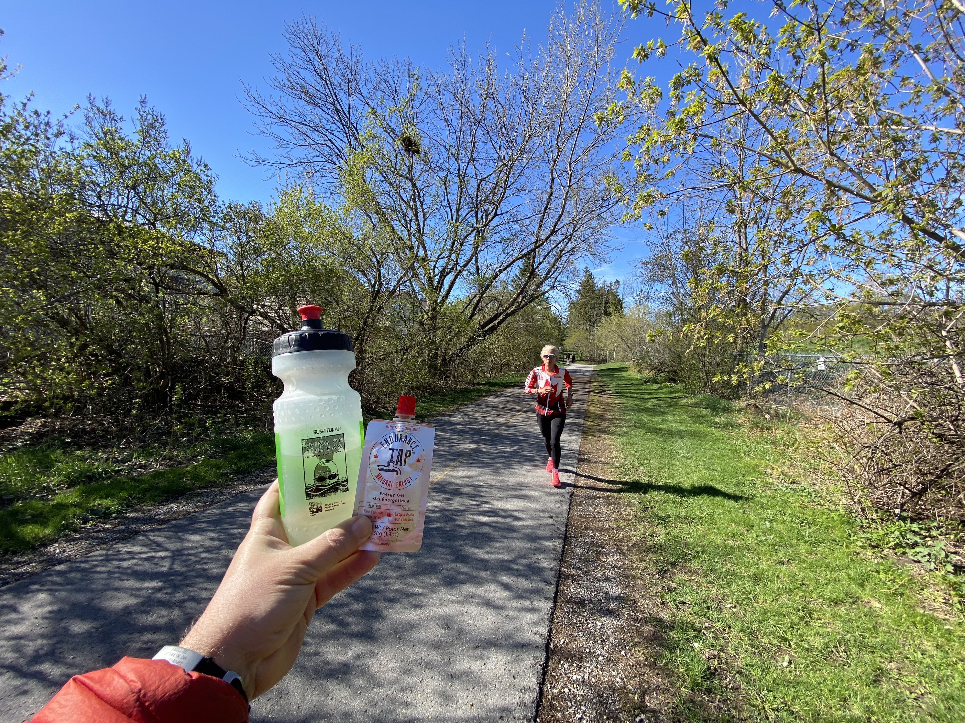 Back at the start line (Checkpoint #3), had a great advantage. Built in bathroom breaks (for runner, and volunteer!), and we can also do a simple adjustment in clothing. On the first round for me, I needed to get some gloves as the bike ride was super chilly on the hands. Also my morning coffee needed a deposit… as well as providing a place for our runner to have a pit-stop. I went a bit crazy here, getting a small table setup so Judy can grab her electrolytes and nutrition, and shed layers as needed. As Running Sherpa, my role is to get this all setup prior to arrival, and then retrieve the water bottle and gel pack trash that is deposited 50-100m along the course.