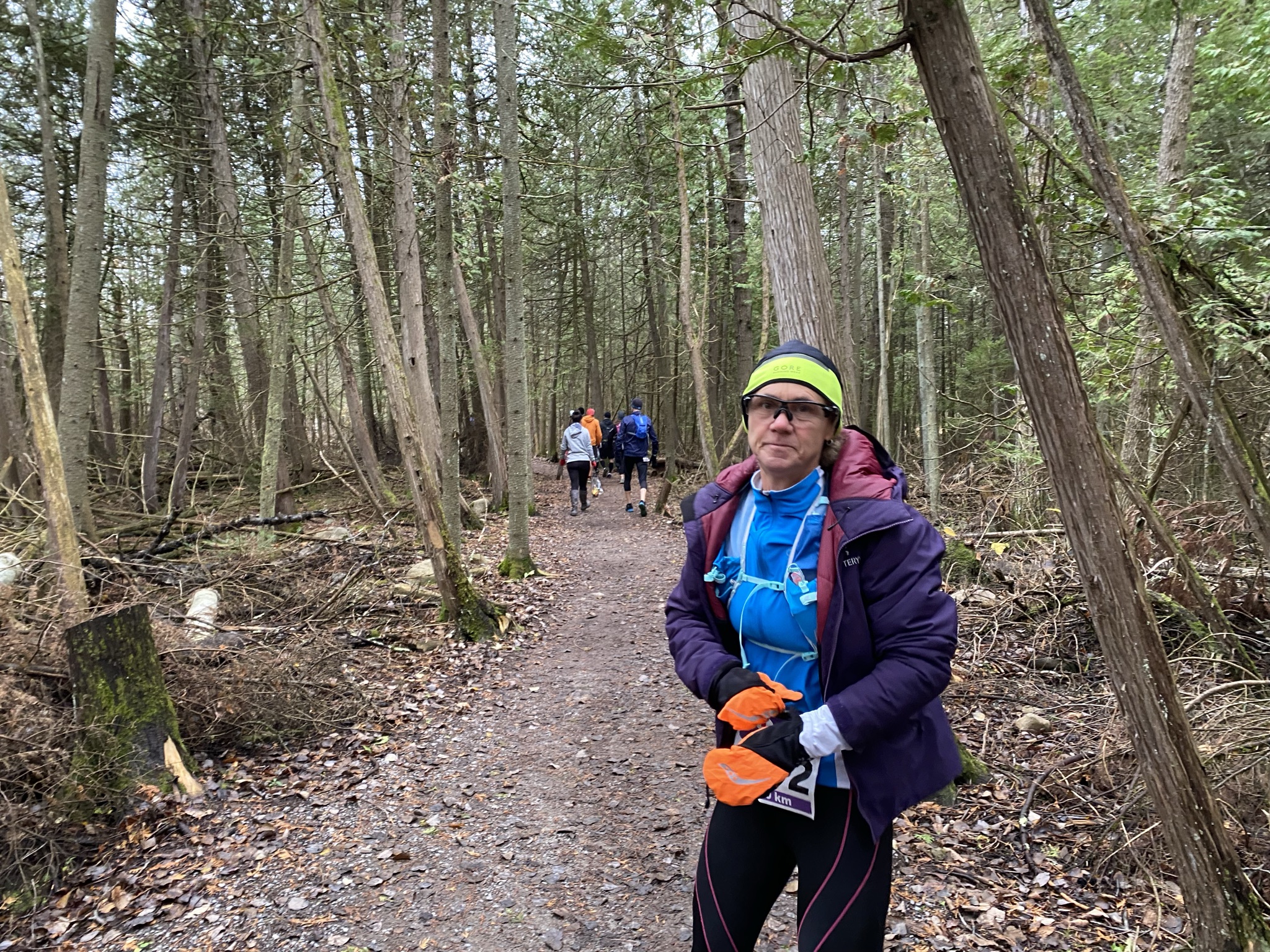 Once we started climbing the hills, pretty well everyone slowed down to a walk at some stage, and then resumed near the crest. At that point, the rolling single track was super enjoyable, and everyone was friendly. A cheerful ‘on your left’ was all that was needed to get someone to yield the trail – often a 50K runner that was on lap 3 or 4 at this time! The trail was full of roots and rocks – so attention was needed at all times – muddy sections appeared everywhere, so you always needed to pay attention to the footing. While completing a secondary loop on a hilltop, the rainy drizzle started converting into tiny snow pellets. These bounced off my jacket, and the woods became alive with freezing rain hitting the fall leaves. Yep, chilly weather – but we were moving enough to stay warm.