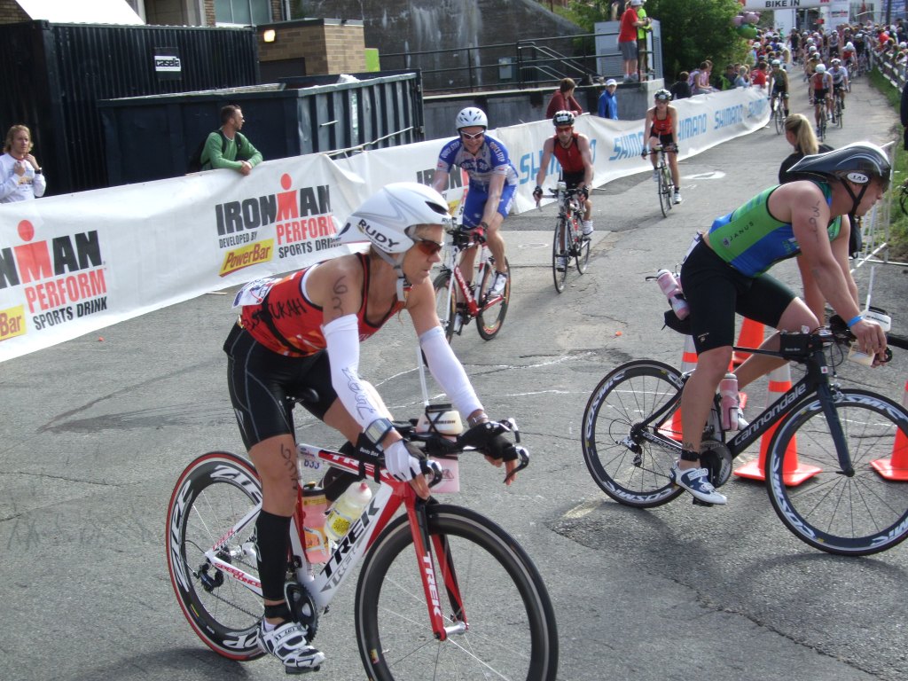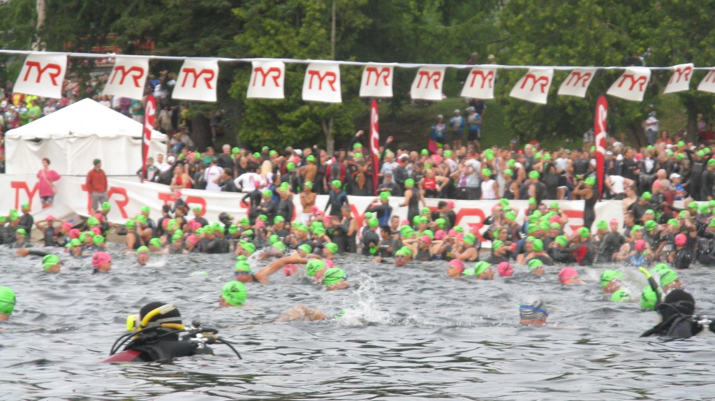 Race day morning when the canon for the pros went off I was still in line for the porta poties. I was running to the start mat taking off the XL Canadian Death Race T-shirt which was covering that tiny little top (I have never done the race Harold bough the shirt at Value Village but it made me look tough!) when Leslie appeared out of the crowd and caught it. I swam though the crowd in the water during all of the American National anthem (sorry about that America) trying to get out from behind the dock. I managed to squeeze in between two large guys in wetsuits two rows back from the front line on the shore side. note: in 2011 ironman races still had mass swim starts