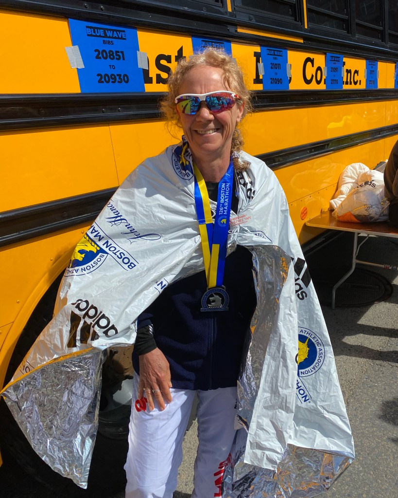 I found Susan whose back held up (thank goodness) and Yvonne in the park. We shuffled back to the subway and then to the hotel. The great thing about the Boston Marathon is that even miles away from the race, total strangers were honking, waving, and yelling congratulations out their car windows. Its awesome.