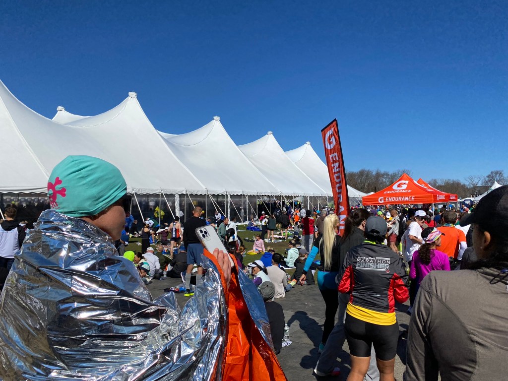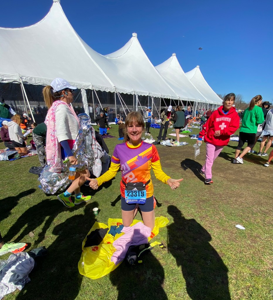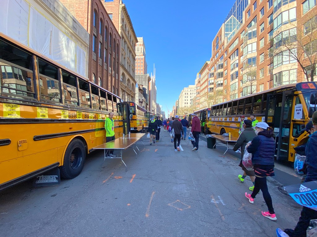 We arrived in Boston Common 20 minutes early so we decided to walk to the bag check (you can leave clothes at the finish line for after the race but it’s not beside the bus loading to the start). It was slow and crowded once we got close to the bag check and slow and crowded again getting back to the buses. By the time we were at the bus loading we were 10 minutes behind schedule. We got on a school bus with a driver who must race Indy 500 on the weekends. She passed all the other buses that left with us. We were at the back of the bus and when we hit a bump we were bounced right out of our seats! Even with our speedy driver we did not have very much time before the start. Usually we sit around in a tent in a field with friends, but this time we basically dumped our extra clothes, visited the porta-poties and went straight to the start line. It was a bit chaotic but I am not sure why.