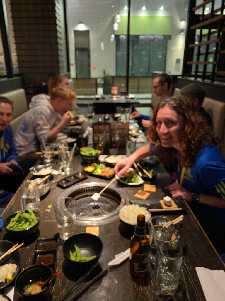 We finished with a group Japanese BBQ diner at Gyu-Kaku, and there was way too much food. Lucky for us we had Yvonne’s teenage son with us to help us eat it, as illustrated in the second photo below hoovering down the excess from everyone.