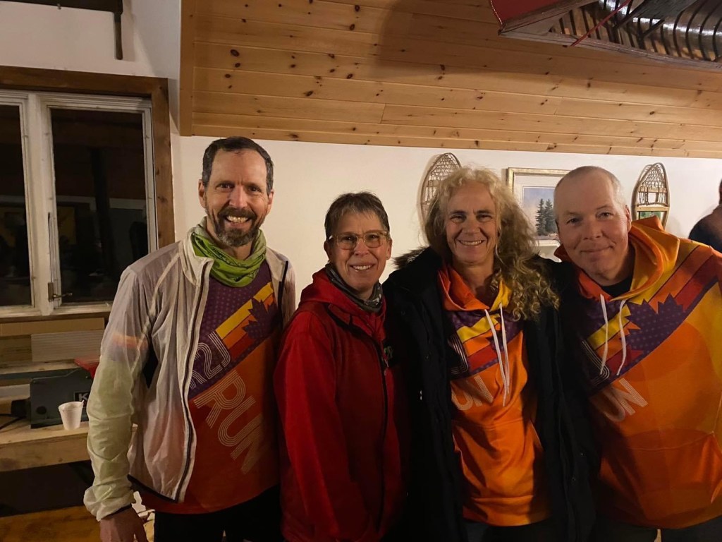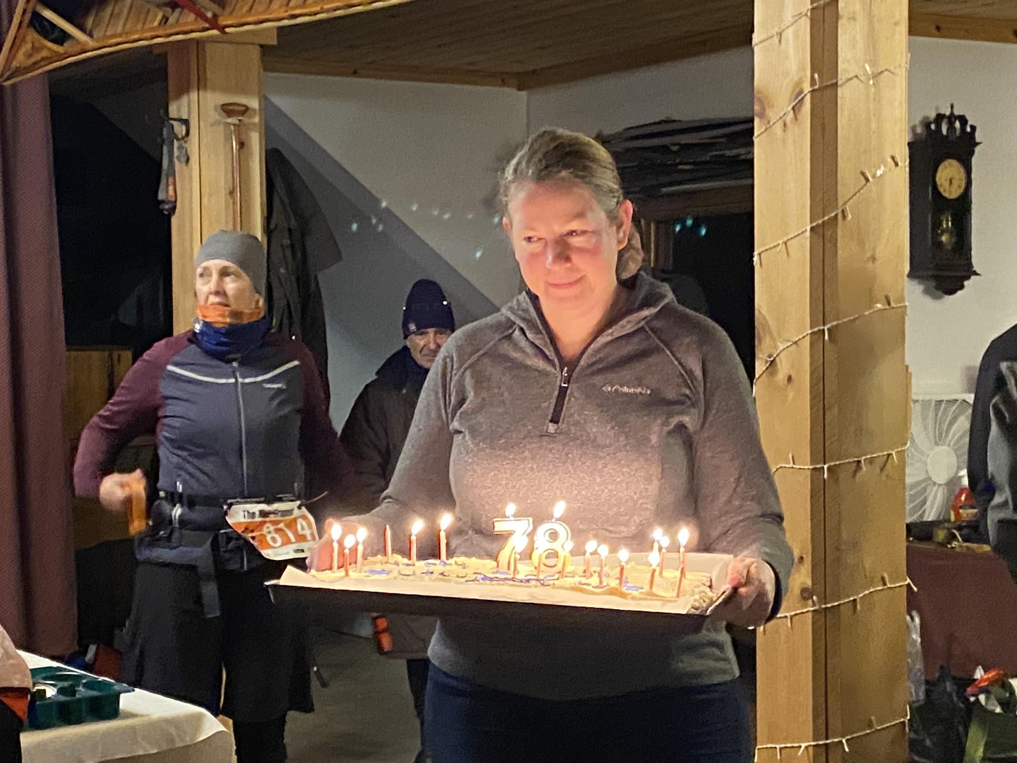 Things going great for first 4km, switching from single to double track a few times in a deep 1 foot partially compacted snow route. Ideal snowshoeing for me. As Mike promised, there’s a bit of a climb around the 4k mark, that brought most of us to a walk, trudging up the steep climb. Huffing and puffing, at the top, we had a few more rolling hills, and then we could see lights of The Arc again. A fast descent down a steep hill, and we made it back with a high-5 and cheer from the finishing crew. Delighted I just signed up for 5K, headed inside very damp from the snow and effort of the run. Great to have a full change of cloths, and quickly swapped into those, and then dug into the Chili and hot chocolate provided. There was even a birthday cake for a friend turning ’78’, and Monique’s legendary brownies!