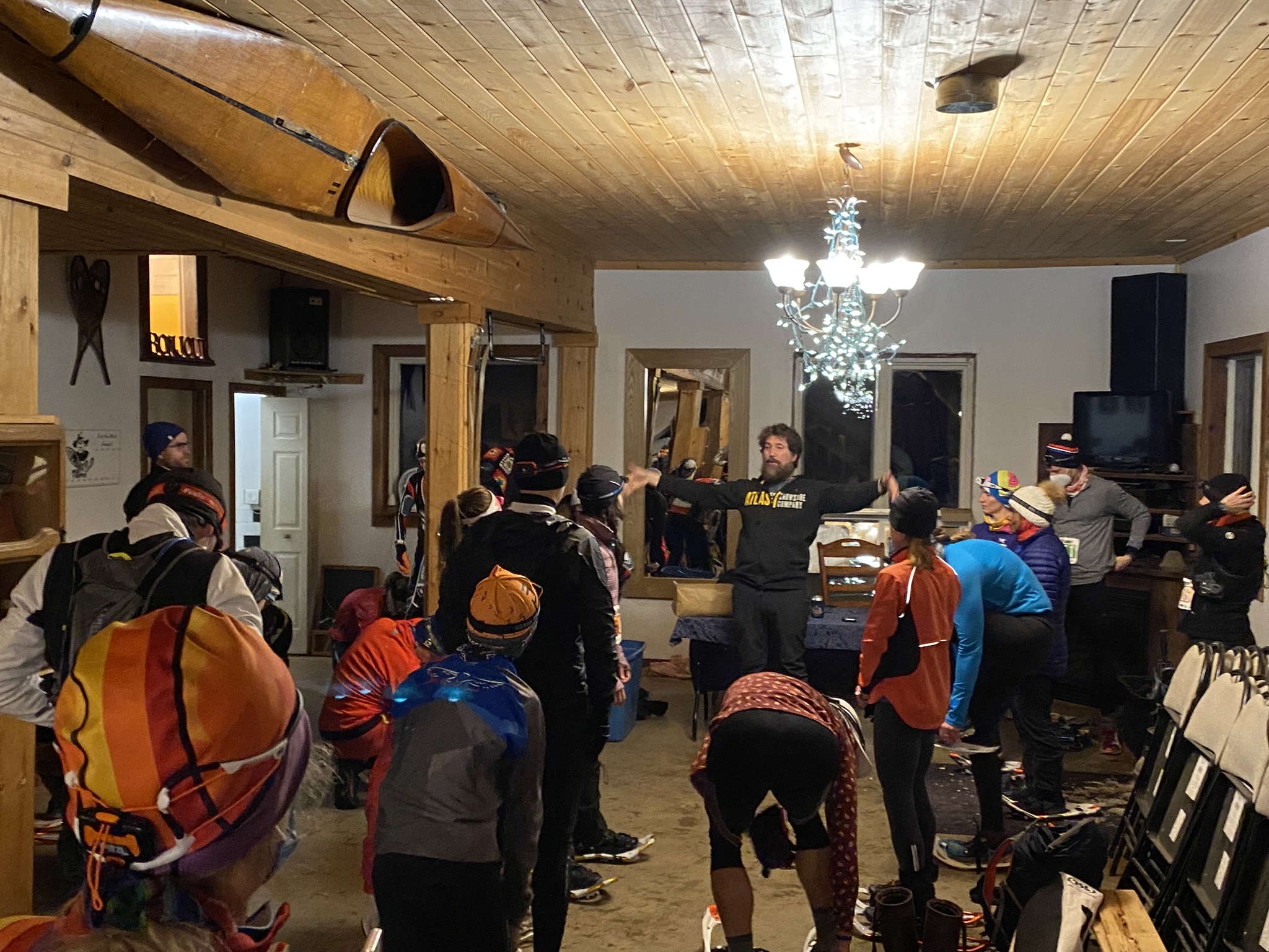 As always, the race starts at The Arc, and we’re quickly checked in and handed a bib by Mike. The indoor venue at The Arc is spacious, and heated by a nice wood burning stove. Plenty of live-edge benches to sit on (made by Mike), and we quicky got on our layers, and I was working on the bindings for the fine Atlas Snowshoes I was able to borrow from Mike as well. A quick briefing from Mike. . . 5&10K runners follow the PURPLE course, and the 3K runners follow the RED course, and we were ready to line up outside.