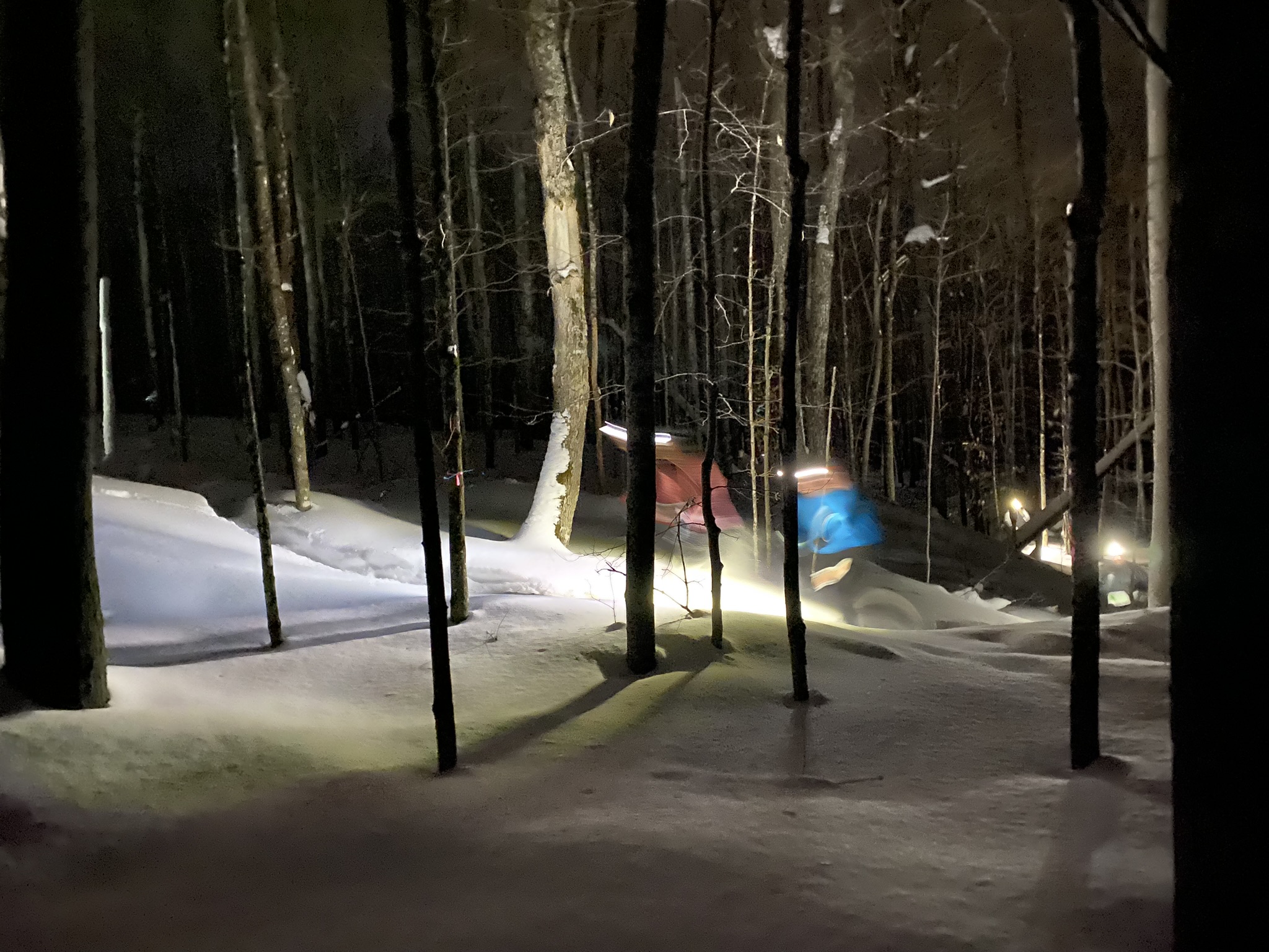 Off we went, and directly uphill! Ugh, a grind up double track which quickly spread out the runners! It also quickly made me realize my bindings were not going to hold, so had to pause withing 200m, and tighten with a bonus knot while everyone else was dashing off. No worries, and got into the grind of climbing the hill, still in contact with the back part of the runners. We all found our pace, and it was easy passing, as everyone was polite and courteous pulling over. Up and down, through the trees in the total darkness with only headlamps to guide you is actually a very satisfying way to run through the deep snow. The trail did zig-zag and double back, and we also got to see some of the lead runners nearly cross our path early on in the run.