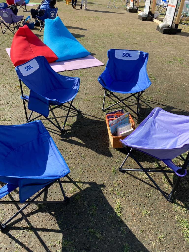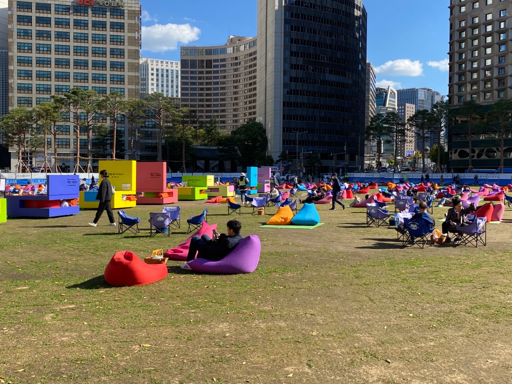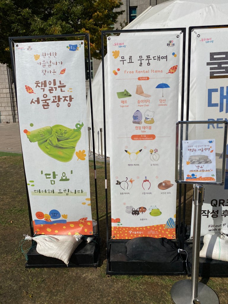 I knew the race started at Seoul Plaza and I was pretty sure there was only one Seoul Plaza, but with a 5:00 am race start I wanted to be sure. I waited until Friday afternoon thinking there would be some sign of a race at 5:00 am the next morning and I found Seoul Plaza. There is a large library building and the Plaza is a free outdoor public library. There were chairs, mats, bean bags and boxes of books to read. There was relaxing music, and you could rent yoga mats for free. It was really cool but there was no sign of a race and the library was open on Saturday. The only sign there might be an event was some kids stuffing what looked like they could be post-race food bags.