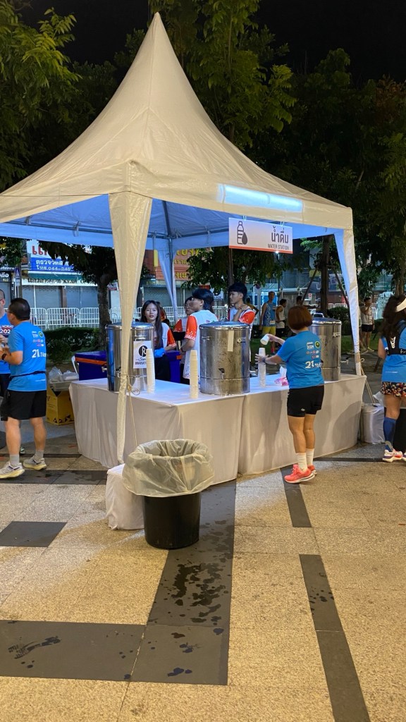 The course was 13km out to a turn where you doubled back and at 19 km turned off to the finish. Korat City has a large military base and most of the course went through the base. There were three bathrooms on the course. There were several bands and a couple of dance groups plus my favourite, the drummers out on the course. I guess the neighbours don’t mind.