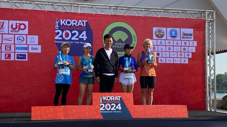 The awards ceremony was a little scattered. With awards 5 deep in 10 year age categories for the marathon, the half and the 10K they had lots to give out. All instructions were in Thai so we had no idea what was going on. When I saw other women with blue Β½ marathon tags I headed towards the stage area. Three lovely ladies who were the other winners from my age group and obviously knew each other came over and collected me. They were very friendly but they spoke no English and I can only say, hello, thank you and how much in Thai. I felt bad that I could not communicate with them. But there were lots of smiles.