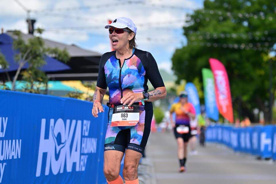 The first thing I noticed was that there were many more tri-bikes than road bikes. I noticed this mostly on the uphills when I was able to pass by some of the other riders. Unfortunately, I don’t have the weight to carry me very fast on downhills, and my top speed was only 54k/hr. There was nothing horrible about the bike ride, but the hills were relentless and there were many. The bike profile on paper was deceiving. On the bike, my motto is always “safety first” so I did feather a couple of the downhills, especially in the two no-pass zones (where others disregarded the no-passing sign). I wasn’t careless, but others were a bit more risky. I didn’t witness any mishaps, but I did see a number of athletes on the side of road for mechanical reasons. As I approached heartbreak hill, I was happy thinking that once the top was crested it would be downhill for 5k into town, but there was another climb!! The climbs on the course were very gradual, but holy cow they were long. I was grateful for all the biking I had done at Golden Lake and in the Barry’s Bay area. Also, I did do all my assigned rides on Rouvy, many of which included unforgiving elevation in very short periods of time.