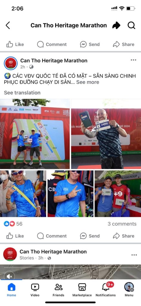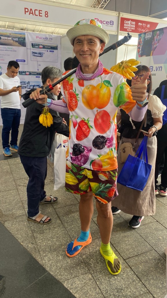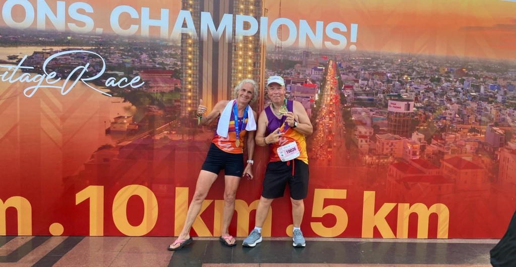 Once we had that worked out we checked out the expo. A race official came over and asked us if they could take a picture. We were rushed to the front of a line of people getting pre-race pictures so they could take ours. A second photographer asked us to pose by the race signs. By the time we got back to our hotel our pictures along with the four other non Vietnamese runners we saw at the pick up were featured on their Facebook page with the message “the international runners have arrived” We felt like Kenyans! Unfortunately, we don’t run like them!