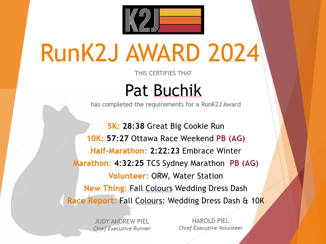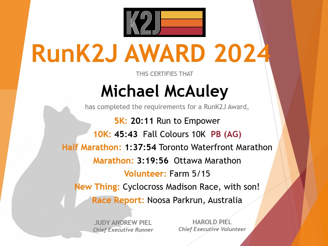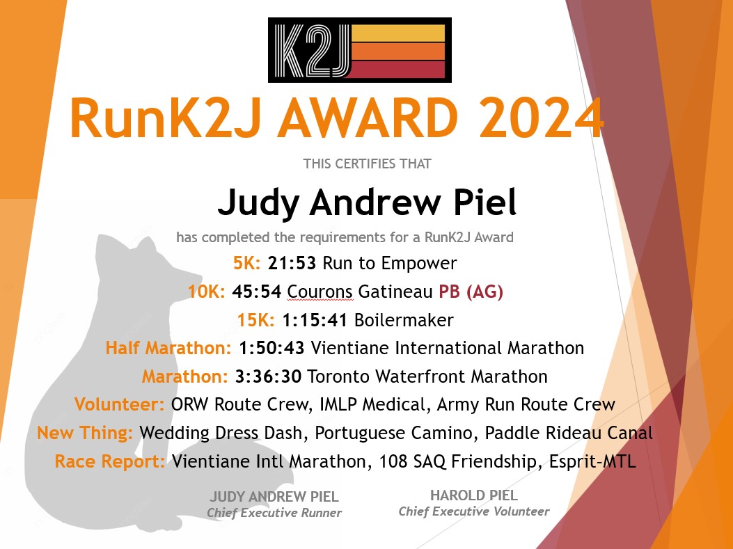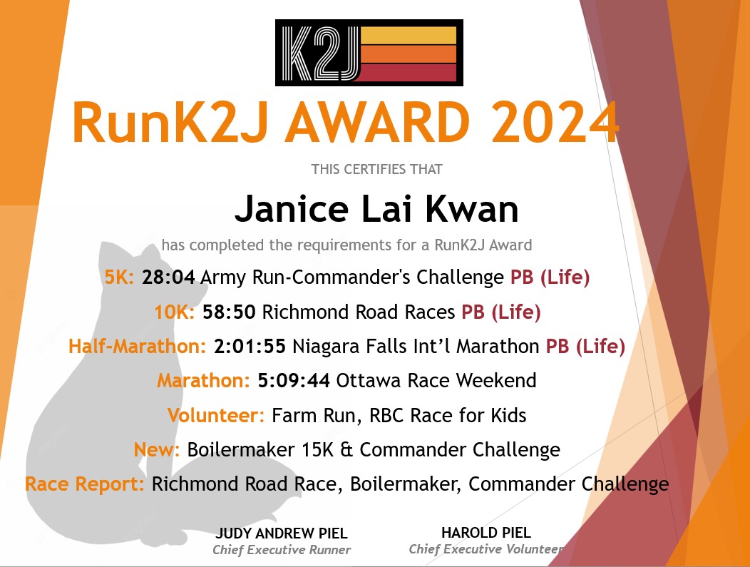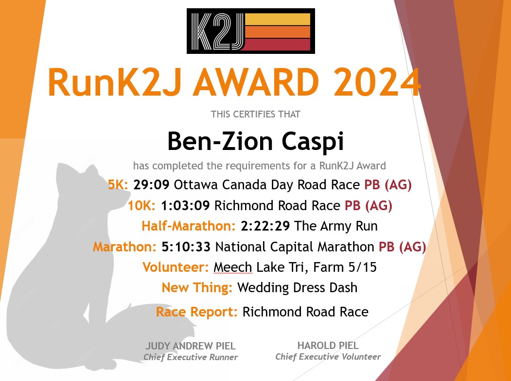 Here we go, the unveiling of the 2024 RunK2J Award Recipients! This year, we had 7 runners that managed to achieve this accomplishment, including our very own Chief Executive Runner!