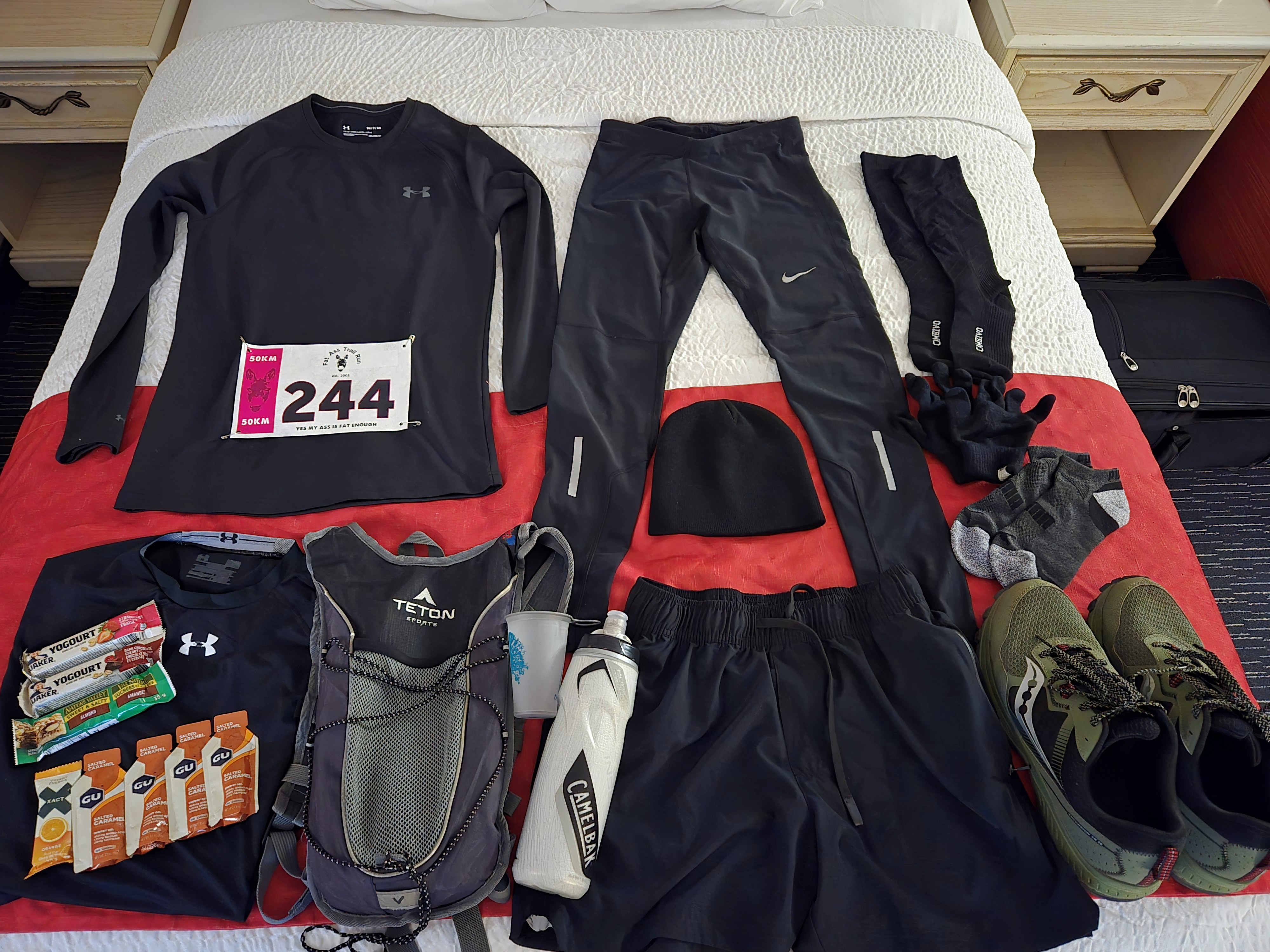 With every kilometer completed, I felt more and more confident that I could actually complete the race —and despite the increasing soreness and achiness —all in one piece! My main goal was to finish Fat Ass and with the race starting at 7:30am, all I had to do was make sure to start the last loop by 3:34pm and the event itself by 5pm….so the main thing was to keep safe and injury free…Being the cautious person that I am, I had overpacked and dressed for the occasion. So after finishing each of the 10K loops, I found myself leaving more and more items behind at my race supply spot….which is easier than not having enough to begin with!