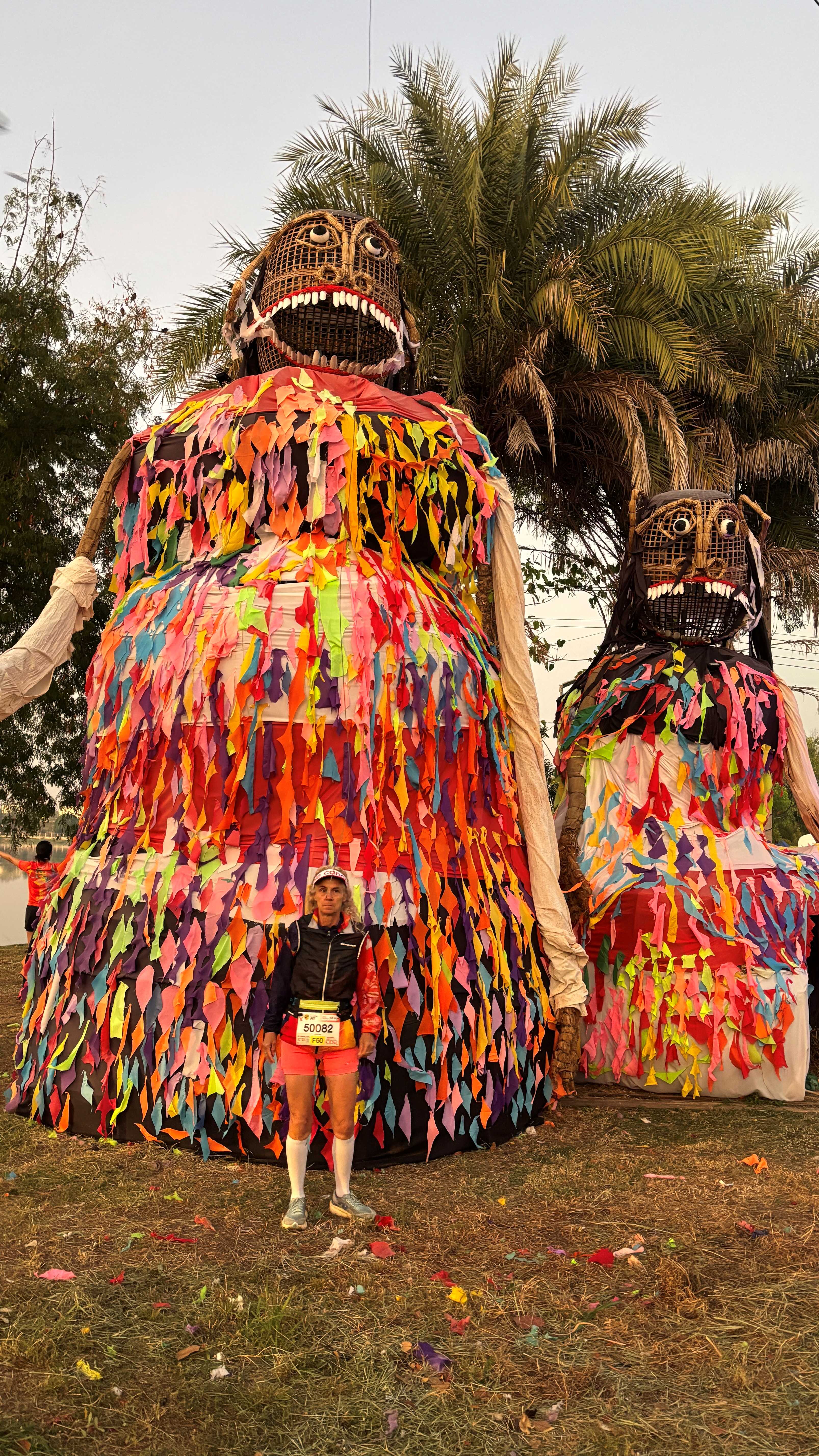 Sunday Race day: This was the main event, and alot more organized with a much larger international field included. Marathon started at 3:00am, and the Half-Marathon judy was running started at 4:00am (with a 3h 30m cutoff). We were staying at a ‘race hotel’ in town, and there was a shuttle bus leaving from in front of our place to get us to the starting area ontime. With a much larger venue and a full international field, it was quite a spectacle: our arrival as ‘from Canada’ was announced as we wandered around the starting area. Organized cloths dropoff great, though longer lines to bathrooms created the usual pre-race scramble. There were corrals setup, and I first watched Judy’s countdown and half marathon start, 3000 runners whiz past with a blare of horns held by sponsors and race officials…. with fireworks lighting up the sky as well to boot!