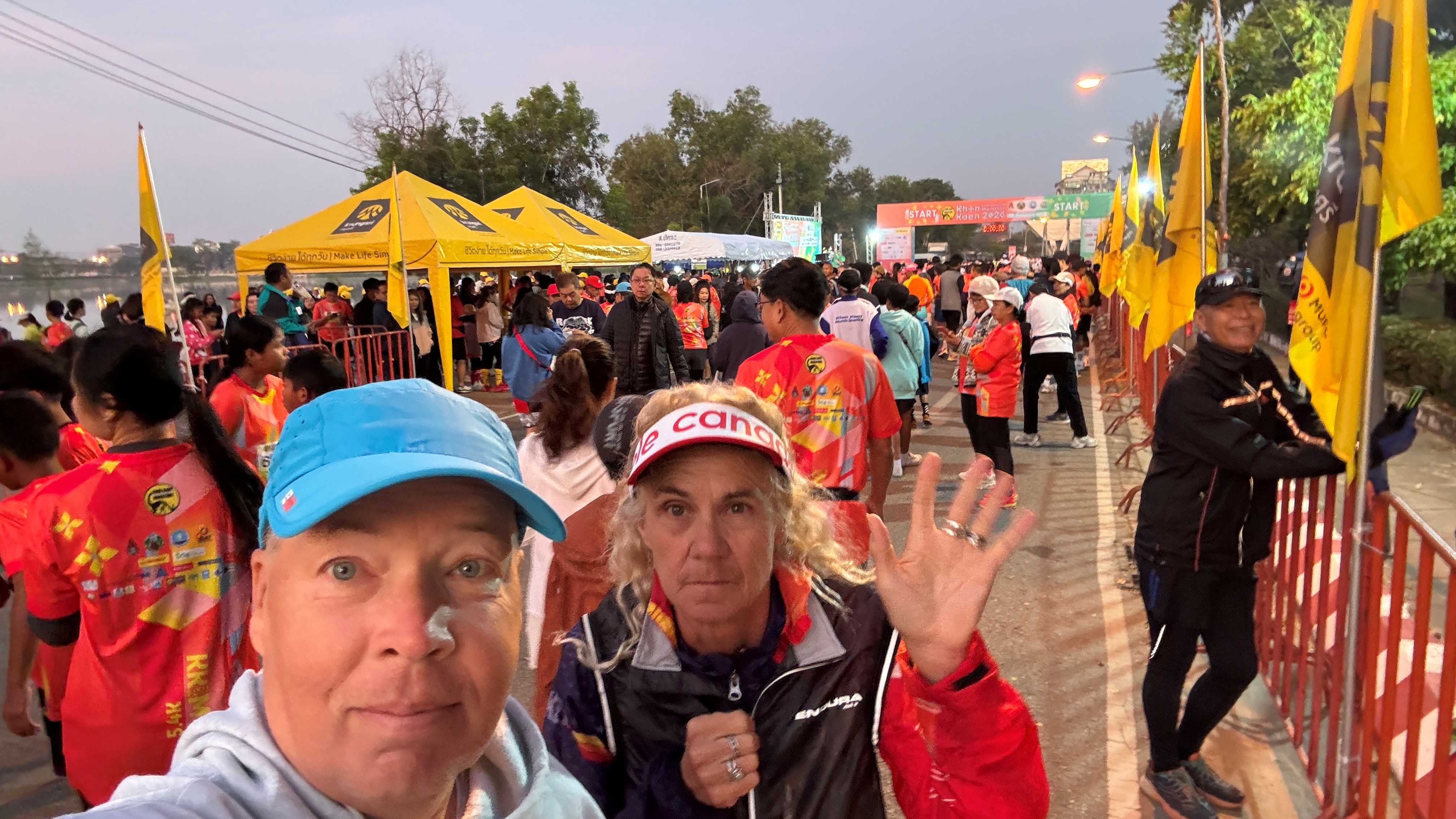 Saturday Race day: On Saturday we woke relatively early (4:30am), and had a pineapple pastry and some coffee for pre-run fuel. With no shuttle to the start, called a GRAB, and zipped the 5-6km to the expo area with plenty of time to spare, which was a slight mistake, as the start line was 1.5km away! Ample time, so we followed the participants and the music to the starting area, and got ready for the 6:00am start. The bib and medal indicated 5.4K, though the timed run itself was modified last minute to be 4.8K. Thai announcers dressed in dinosaur costume got the crowd pumped, and there was even a bit of English occasionally. Definitely minimal foreigners at this smaller event. No cloths drop for our warm layer in the 12C morning, but many people (ourselves included) dropped off top layers at the starting area, and I returned later on to pickup the hoodie I left behind. We probably had a thousand participants in the competitive and non-competitive groups. There was also shorter kids 2.8K. Some odd University creations got everyone taking photos, us too!