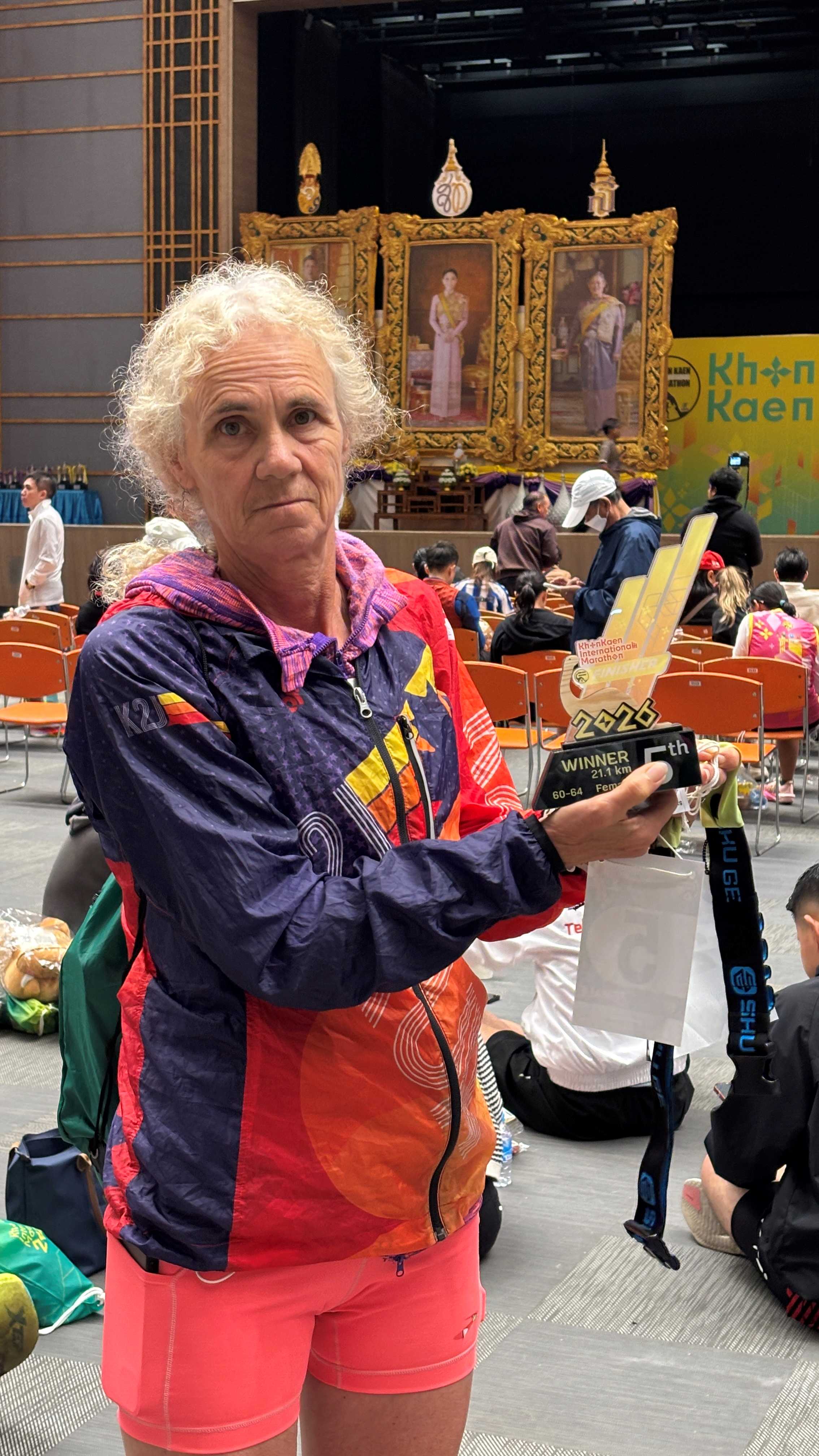 As the run progressed and we were 2km from finish, the half and full marathon runners merged onto our route, and this got the roads busy with runners again. We could hear the announcements and music well before we saw the sight end, and cruising over the finish line was a great feeling for another nice run in Thailand. Medals handed out, drinks provided, and also got a strip of 6 tickets to pickup food and beverages at the numerous food tents setup at the end. Found Judy here too, and she won another AG finish with 5th place finish, so we went to pickup extra food from the mind boggling 135 booths preparing post-race meals, and made our way into the Convention Hall where the awards were being finalized before being handed out. Note the Thai King and Queen were at the awards, handing out finisher prizes to overall winners of the Marathon. The Queen is an enthusiastic runner!